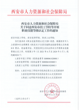 日前,经西安市人力资源和社会保障局备案评估,西安技师学院获得西安市首批社会培训评价组织资格,可面向社会劳动力开展电工、车工、钳工、汽车维修工、保育员、高低压电器成套设备装配工和变压器互感器制造工等七个工种的职业技能等级认定工作。