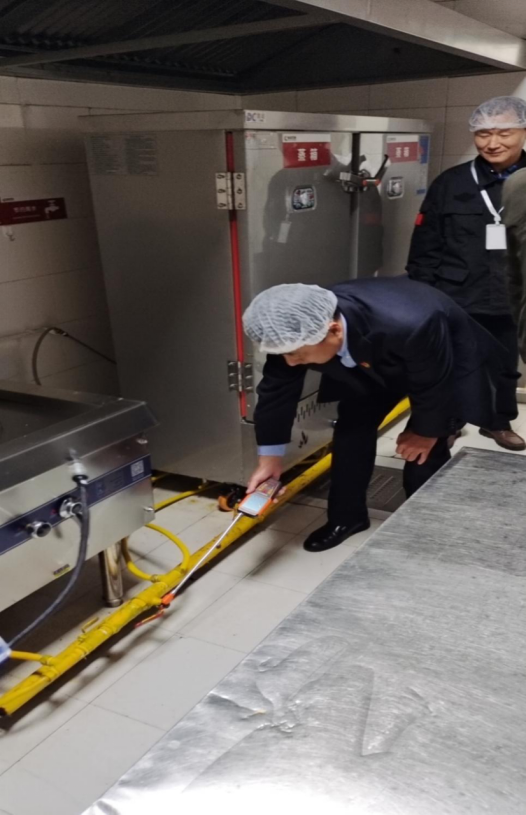 检查人员先后查看了一楼、二楼食堂天然气设施情况。通过检查,发现学院天然气管理相关制度已经上墙,日常点检详实,并且已经实行燃气关闭测漏打卡机制;食堂一、二楼天然气所有管道接口、阀门总体情况良好,无漏气现象存在;相应场所按照规定配备了灭火器、灭火毯;食堂燃气安全管理规范,制度齐全,责任落实到位。