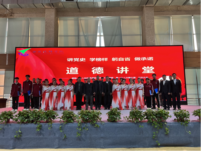 最后,活动在全场人员共唱《没有共产党就没有新中国》的歌声中落下帷幕。本次道德讲堂,适逢建党百年,党史教育正当时,每位党员、团员、学生当以党史学习教育为契机,从党的百年奋斗历程中汲取智慧和力量,不断提升自我修养和理论知识储备,自觉接受一次革命传统教育和思想政治洗礼,筑牢信仰之基,践行初心使命,以为祖国奉献为荣、为人民服务为乐,不断提升自己的道德素质,以昂扬向上的精神状态与国家发展同频共振,用青春书写无愧于时代的华彩篇章。