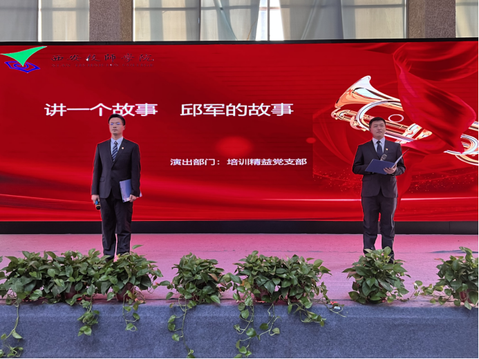 在讲一个故事环节,我院荣获中国西电集团“十大杰出青年”荣誉称号的青年教师穆婷,讲述了自身从学院求学到成为骨干教师的励志事迹,激励了全场观众。培训精益党支部李凯、武振两名党员同志声情并茂的讲述了央企楷模邱军的故事,感人至深,催人泪下,深度还原了为社会奋斗、鞠躬尽瘁的企业劳模形象,为全体师生树立了工作、学习的榜样。