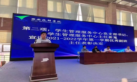 在雄壮的国歌声中,大会拉开帷幕。学生管理服务中心党支部书记、主任崔嵬宣读了2021—2022学年第一学期优秀副班主任表彰决定,赵雨昕等31名同学荣获2021—2022学年第一学期“优秀副班主任 ”荣誉称号。