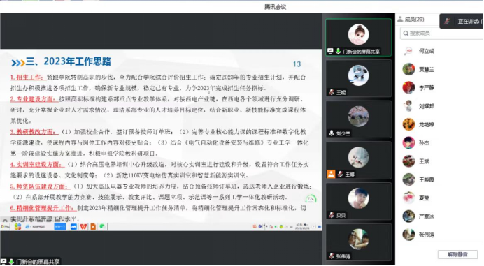 为全面总结电气技术系2022年度各项工作,扎实推动电气技术系2023年各项工作全面起势、有序推进,2022年12月26日,电气技术系组织召开期末工作总结大会。会议由门新会副主任主持,电气技术系全体教职工参加线上会议。