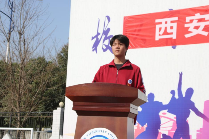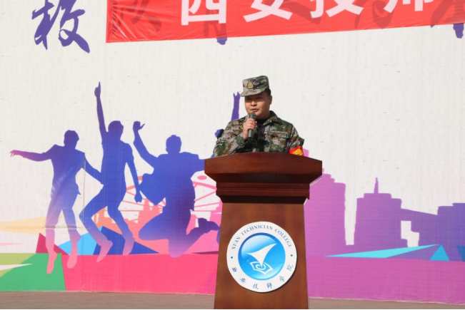 机电技术系25G机电2班王龙翔代表全体参训学生发言。他表示坚决服从教官的管理,虚心向教官学习,努力完成规定的军训任务。
