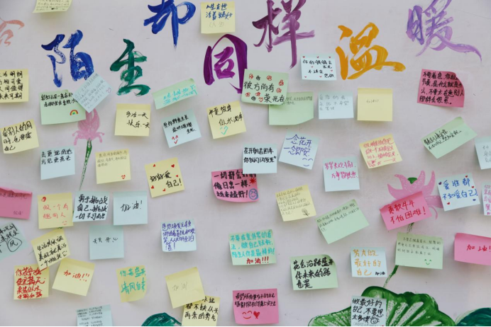 本次环节中,最受欢迎的是“祝福陌生人”。该活动以学生在展板给陌生人留言的方式,帮助学生在沟通中减少误解,不惧表达,悦纳自我。在留言区,每个同学都写下对陌生人的祝福话语,随后进行张贴,大家用一颗真诚的心温暖他人,感受人与人之间的善良和真诚。