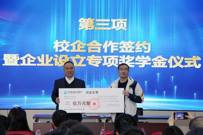 仪式还设置了校企签约、奖学金设立、导师聘任等环节。学院与陕西正合芯科光电技术有限公司签署合作协议,围绕人才培养、实习就业深化校企合作,该公司设立“正合芯科专项奖学金”5万元,用于支持技术技能人才培养并激励优秀学子。